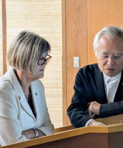 展示会場では、多くの来場者が足を止め、様々なテーマを与えてAIと哲学の融合が生み出す知的な対話に聞き入りました。特に、視察に訪れた英国のジュリア・ロングボトム駐日大使は、坂村健INIAD創設者の説明を受けながらシステムを体験。「2025年に仏教から学べることは何か?」という問いかけを行い、その結果を受けて「かつての哲学者らが現代で生き生きと活発に議論し、面白かった」と感銘を受けた様子でコメントし、その様子は新聞でも報道されました。