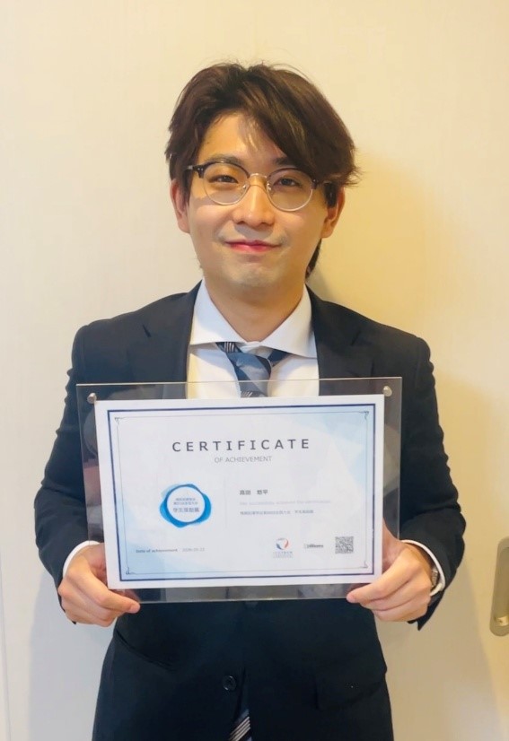 このたび学生奨励賞をいただき、大変光栄に思います。研究する中でなかなか結果が出ず、苦しんだ時期もありましたが、中村周吾先生をはじめ、研究室の皆さん、家族、本実験に関わっていただいたすべての皆様のおかげでなんとか形にすることができました。特に中村先生には研究内容だけでなく、いろいろな物事に対する視点や姿勢も本研究を通して学び、多大なる支えをいただきました。ここで学んだことを活かして、社会に貢献できるよう精進してまいります。改めて、皆様のご支援とご協力に深く感謝を申し上げます。本当にありがとうございました。