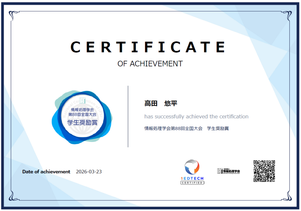 2026年3月6日~8日に松山大学にて開催された情報処理学会第88回全国大会において、中村周吾研究室・卒業研究生の高田悠平さんが発表した研究「大規模言語モデルを用いた意見データセットの生成」が学生奨励賞を受賞いたしました。本研究は、情報連携学科の本多泰理教授、佐野崇准教授との共同研究です。