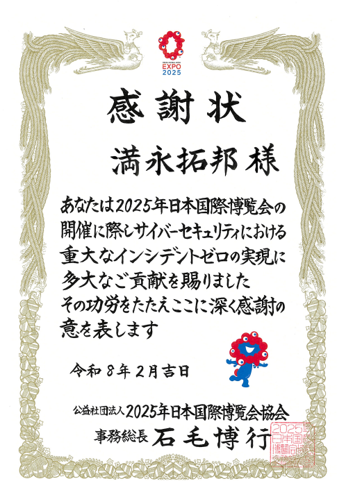 情報連携学部の満永拓邦教授が、2025年日本国際博覧会協会より感謝状を授与されました。これは、同協会のサイバーセキュリティ委員会のメンバーとして、安全・安心な万博ICT運営に向けた取り組みに貢献したことが評価されたものです。